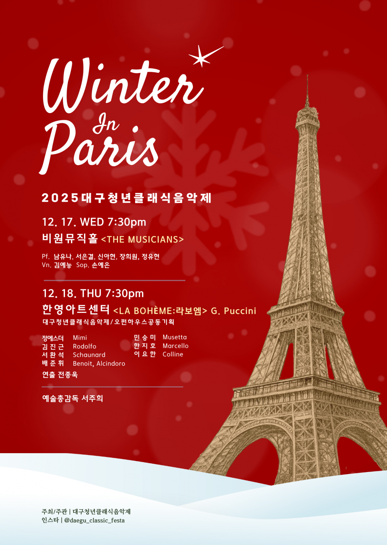 목록 2025 대구청년클래식음악제 <라보엠> 페이지 정보 기간 20251218 ~ 20251218 시간 오후 7시 30분 장소 안암홀 주최 대구청년클래식음악제 주관 대구청년클래식음악제, 오펀하우스 입장료 전석 5천원(현장구매) 문의전화 010-2496-3154 전시소개 본문