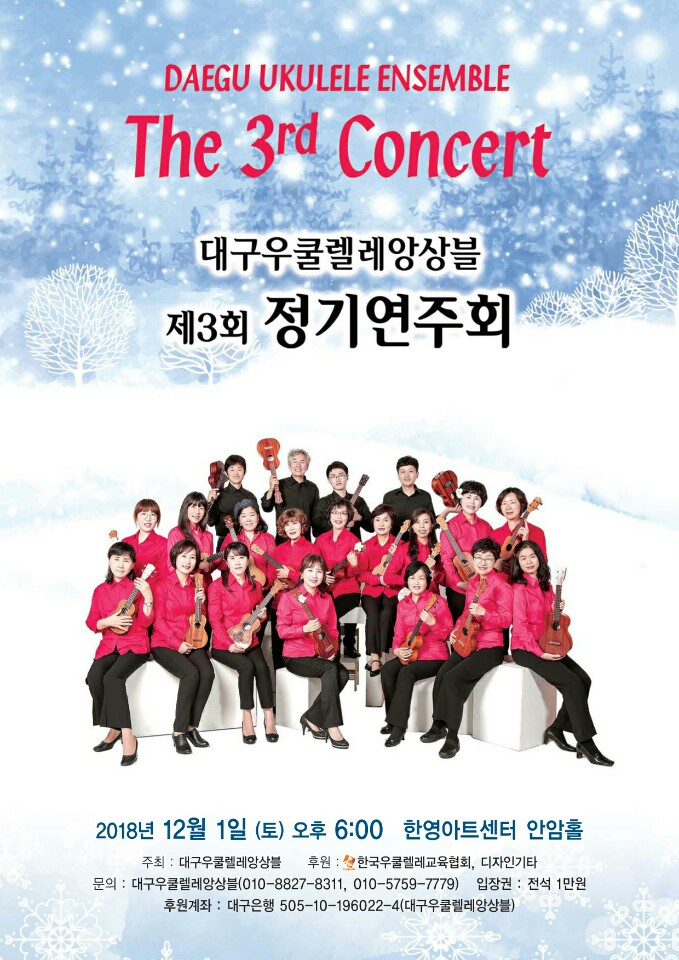목록 대구우쿨렐레앙상블 제3회 정기연주회 페이지 정보 기간 20181201 ~ 20181201 시간 18:00 장소 안암홀 주최 대구우쿨렐레앙상블 주관 입장료 문의전화 전시소개 본문