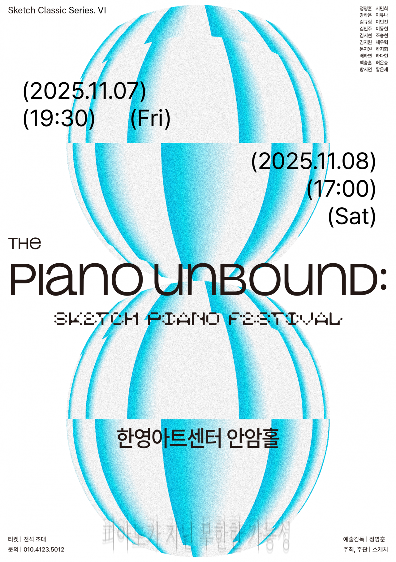 목록 The piano unbound 페이지 정보 기간 20251107 ~ 20251108 시간 오후 7시30분( 금), 오후 5시(토) 장소 안암홀 주최 스케치 주관 스케치 입장료 전석초대 문의전화 010-4123-5012 전시소개 본문