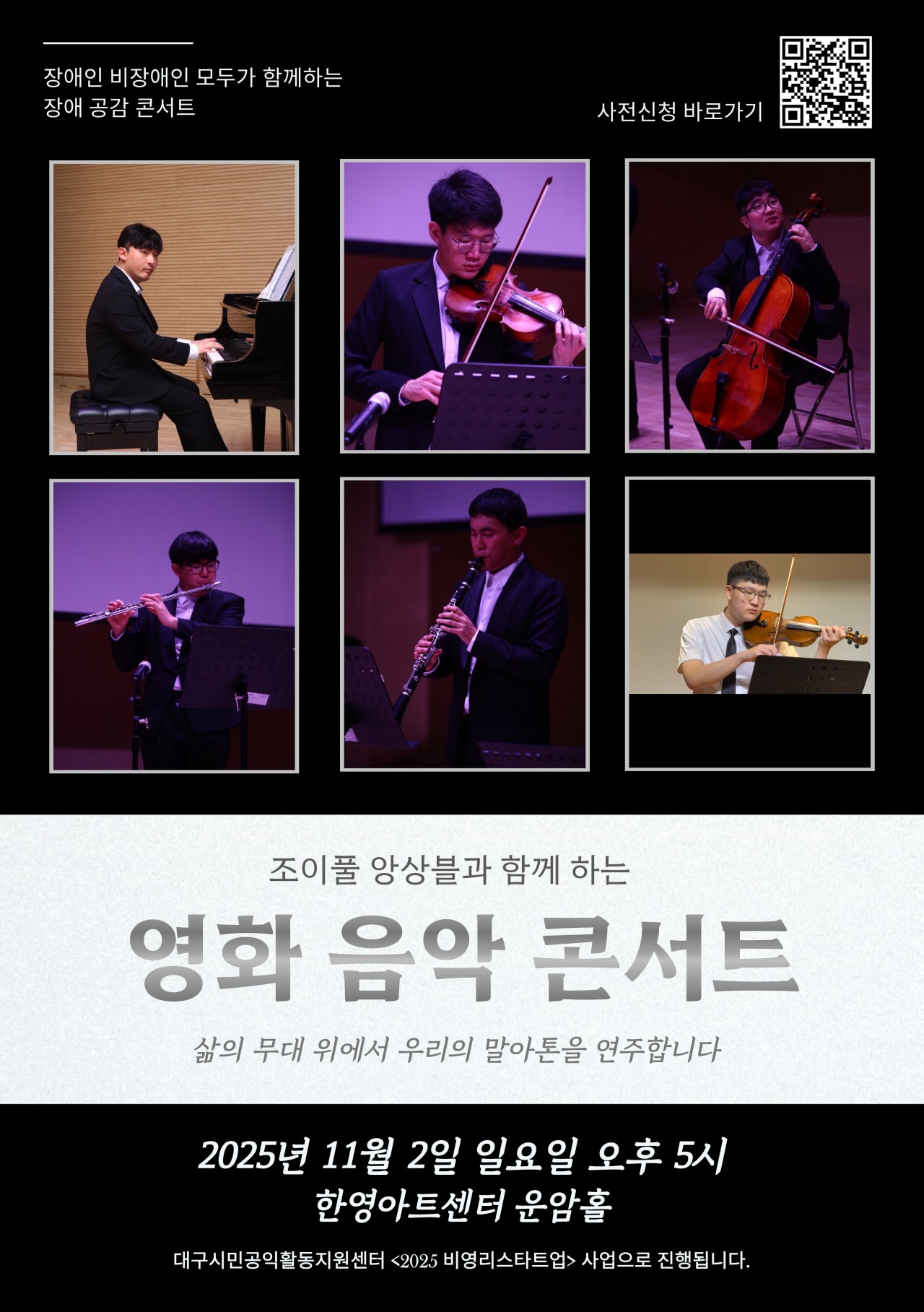 목록 조이풀앙상블 <영화음악 콘서트> 페이지 정보 기간 20251102 ~ 20251102 시간 오후 5시 장소 안암홀 주최 주관 입장료 문의전화 010-4306-3336 전시소개 본문